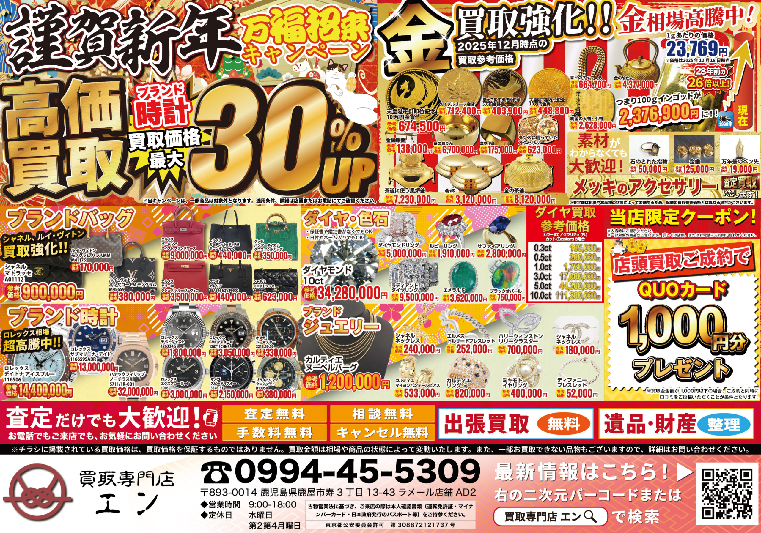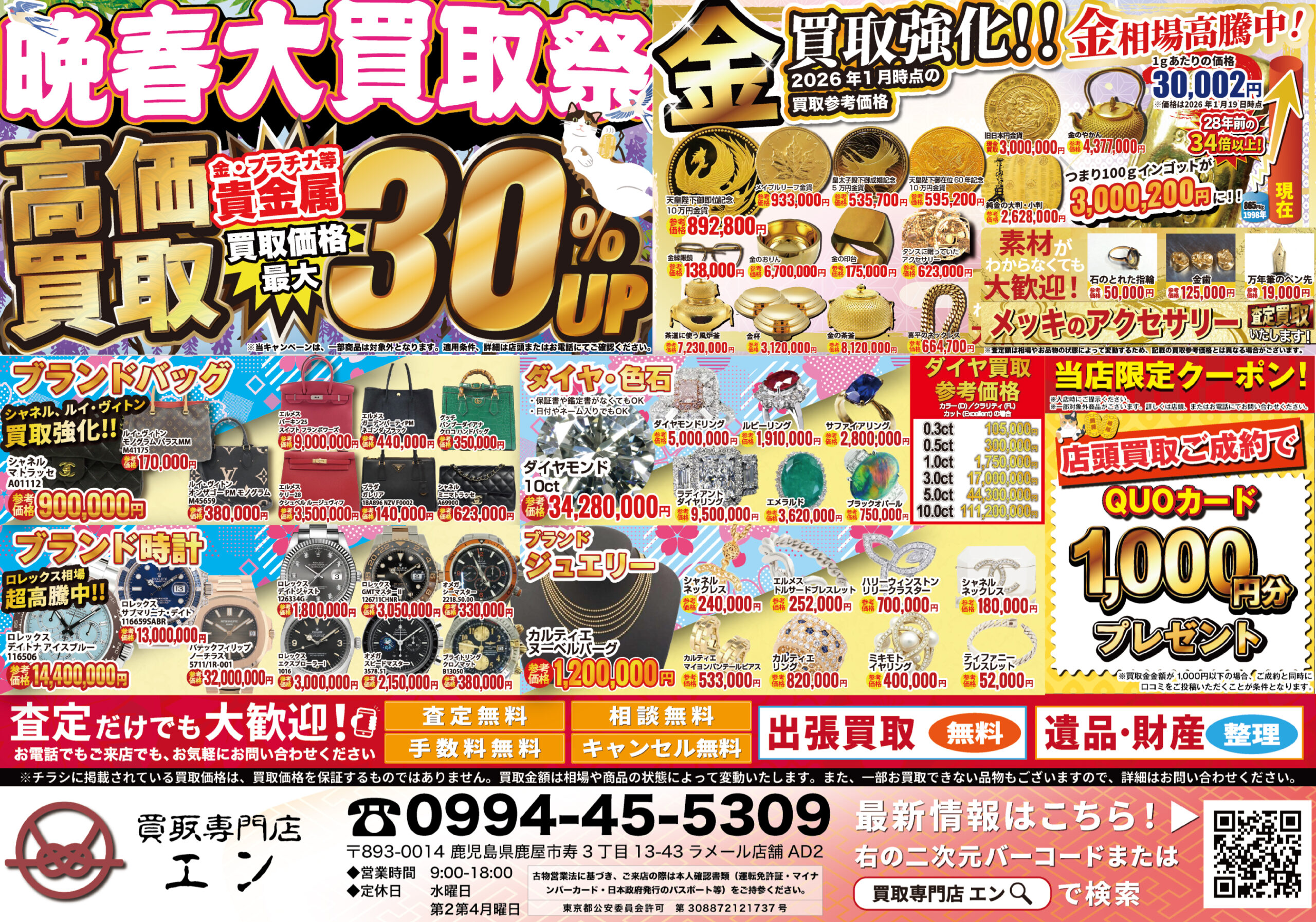 キャンペーン実施店舗 店舗までの道のり 本町方面より国道269号線のルートでお越しの方 STEP 寿二丁目交差点を直進し、県道68号線志布志方面へ STEP 寿二丁目交差点から約1.1km、寿一里山交差点を左折(ラーメン丸源さん・スシローさんが目印です) STEP ソフトバンクさんを通過し、PONOストレッチボディケアさんの隣に店舗がございます。 STEP 到着です!店舗前に駐車場もございます! スタッフ紹介 稲盛 清香店長遺品整理士 2023年6月18日にオープンした、鹿屋市寿町にある買取専門店エンのオーナーの稲盛 清香です!当店では国内だけでなく海外、特に中国への豊富な販売ルートを確保しているため、他社に負けない高価買取を実現しております。地域NO.1の買取価格を目指します!また、遺品整理士の資格保有者も在籍しており、遺品整理も承っております。お気軽にお問い合わせ下さい!